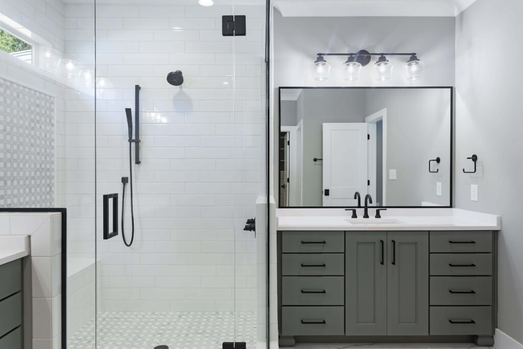 A bathroom with a large mirror and grey cabinets.