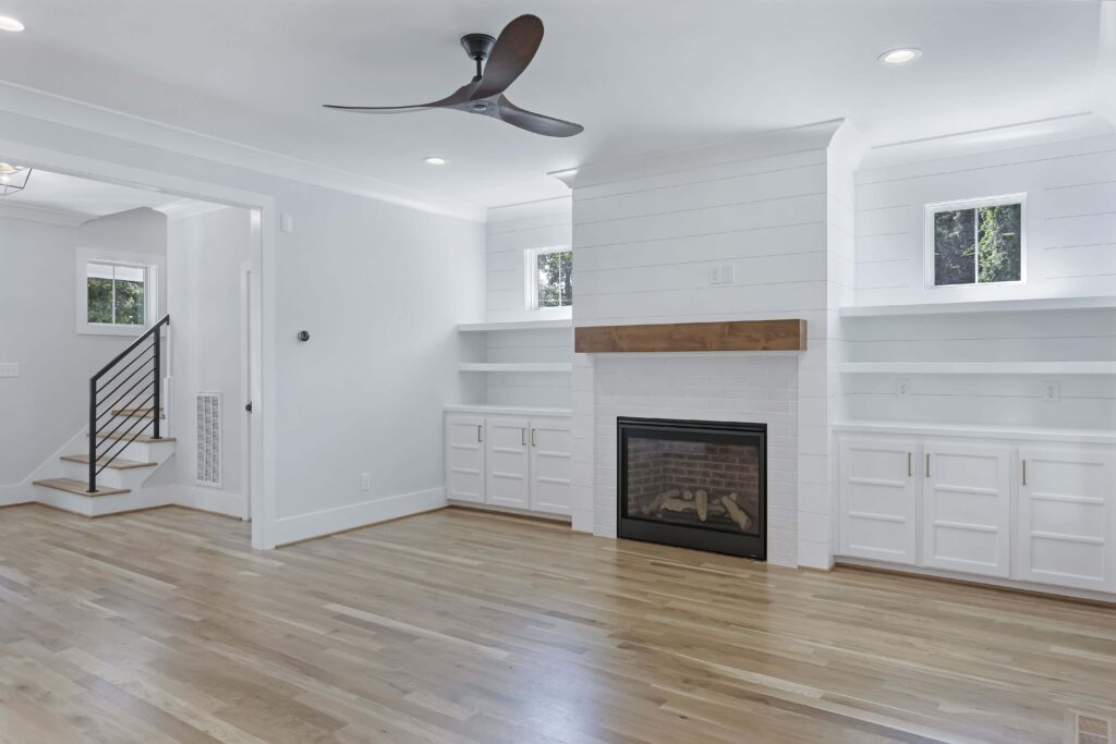 A room with a fireplace and some shelves