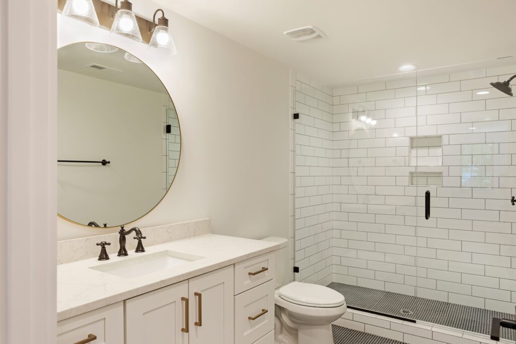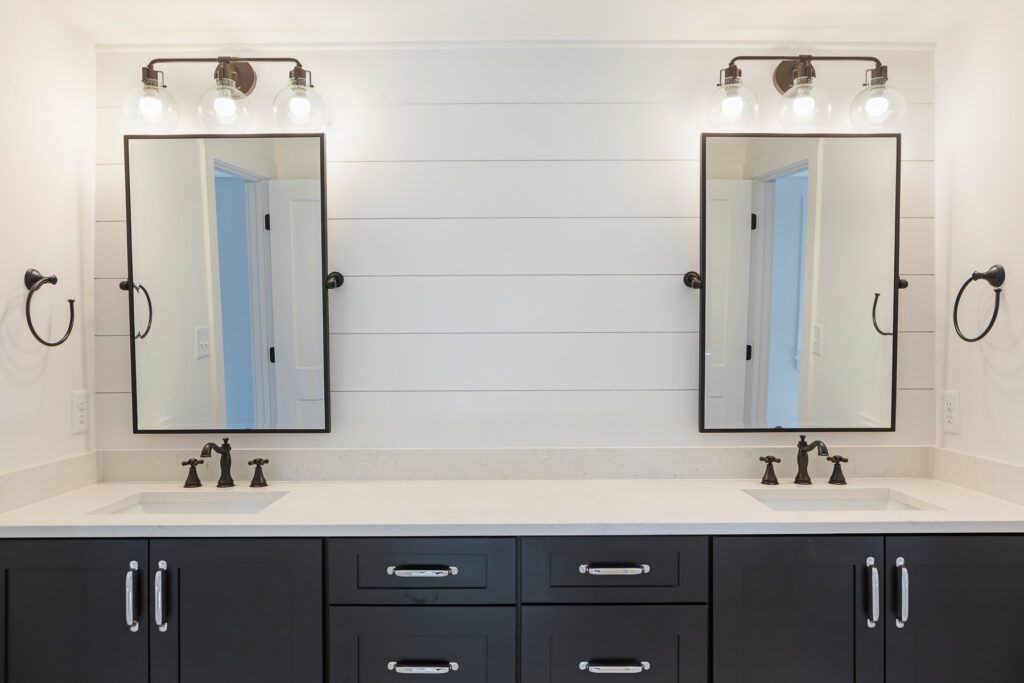 A bathroom with white cabinets and a large mirror.