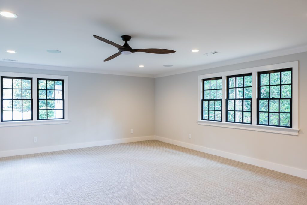 A room with two windows and a ceiling fan.