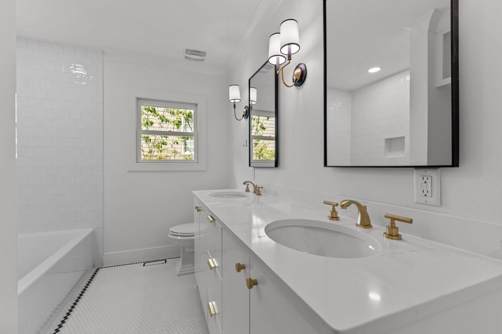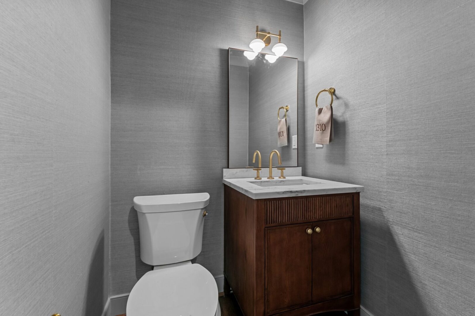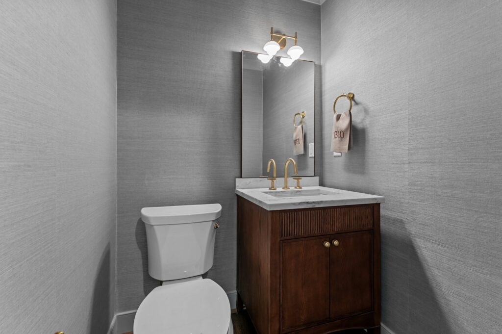 Throughout each bath, refined finishes, thoughtful layouts, and subtle textures bring a calm, sophisticated sensibility to every detail. From the serene primary suite to the polished grasscloth powder room, each bathroom blends form and function along with tradition and innovation. The basement bath features clean, simple tilework that adds elegance and makes the space feel larger and lighter.